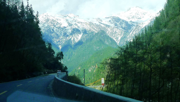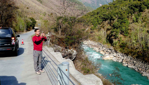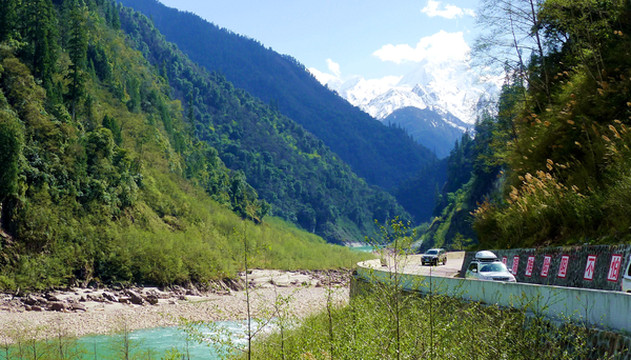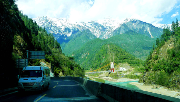我们也在桥头观景、拍照,逗留约20分钟,直至16:40方才过桥。过桥后再走不远就是“通麦”镇,没有停车,直驶而过。通麦过后的景色更是绝佳,17:14再遇公路暂时封闭,也还是因为道路维修,我和X.J.下车观景,周边绿树衬托雪山,碧蓝的“帕隆藏布”伴随公路蜿蜒,川藏线上处处可见美景。