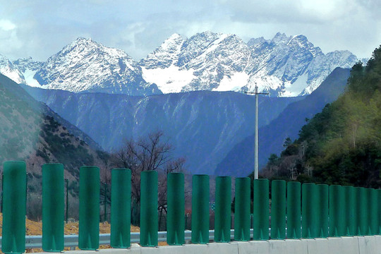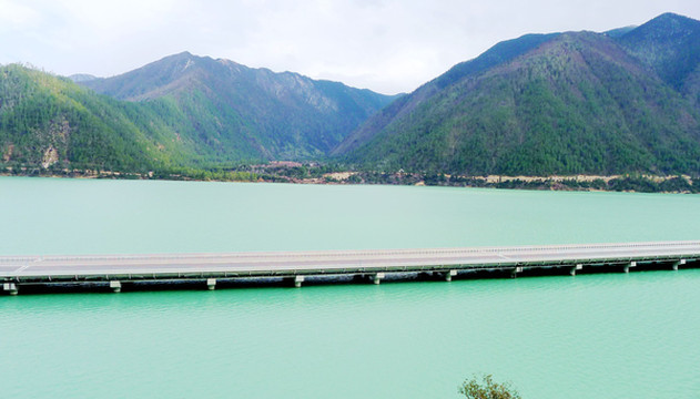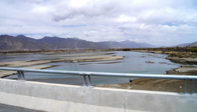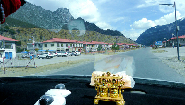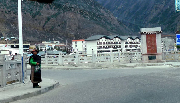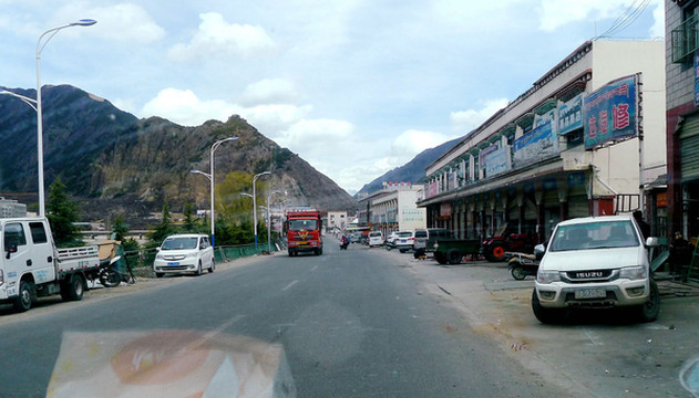随后驶经“中流砥柱”景点,尼洋河中央耸立一块巨石,岸边还有一座观景小亭,但我们既没看见巨石,也不能接近小亭,因为景区正在施工,路边设置的遮挡物将小亭封闭。而且,这一带的公路也十分狭窄,邓师傅说为保安全不能停车。15:30在“工布江达”县城外围驶过,路边有座“泉州二桥”,经此桥过河便可进入城区。我们没有过桥,只是绕城而过,再上拉林高速。工布江达是由我们福建援建,城内还有一座更大的桥,称“泉州大桥”。