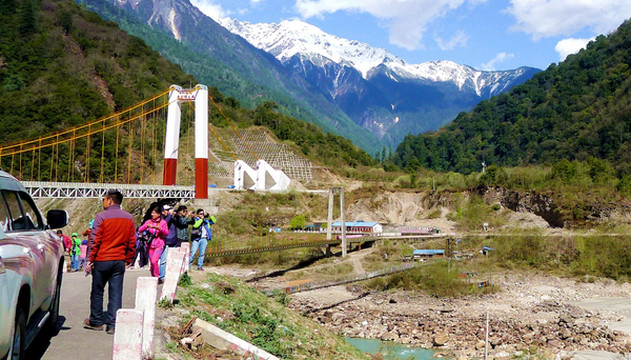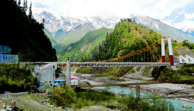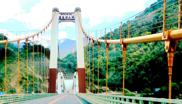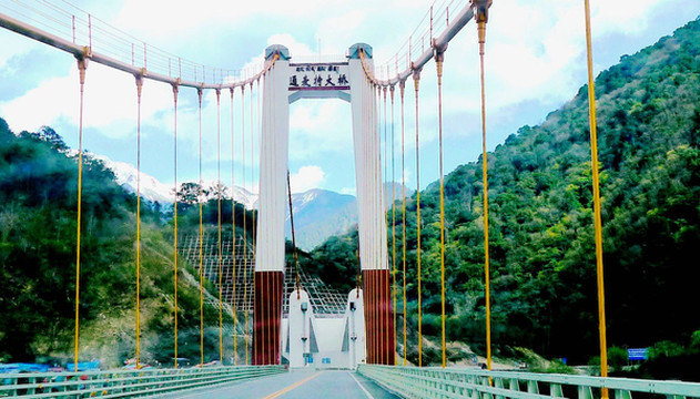 16:19驶抵“通麦特大桥”,“易贡藏布”在此处汇入“帕隆藏布”,两江合流后向南,最终注入雅鲁藏布江。“通麦特大桥”是架设在易贡藏布的江面之上,距离两江汇流处仅数百米远。在这座“特大桥”尚未修建以前,此地称“通麦天险”,它是旧时川藏线上著名的“瓶颈”。现时仍可看到不长的一段易贡藏布江上竟然是有三桥并列,它们各具非凡身世:最北面的单塔吊桥就是现时川藏线上正常通车的“通麦特大桥”,高大、雄伟,2015年底建成;中间的那座双塔吊桥称“通麦大桥”,它是2000年为了代替此处曾经存在过的一座钢筋水泥大桥而紧急抢建。当年“易贡藏布”上游的“易贡湖”堰塞坝溃决,洪水裹挟泥石将那座钢筋水泥桥梁冲毁,致使川藏线中断,人民子弟兵紧急赶工,抢建了这座双塔吊桥。由于它属紧急抢建的“保通”性工程,只能单车、单线放行,而且还曾发生过两次垮桥,造成车毁人亡,所以,此处就成为川藏线上的著名“瓶颈”,号称“通麦天险”;最南侧的那座简易桥只能通行人马,不能过车,它比“通麦大桥”建造更早,曾在“通麦大桥”垮桥期间发挥过重要作用,但现时已被弃用。“通麦特大桥”建成后,这一段的川藏线已是畅通无阻,游客纷纷停车拍照,现时的“通麦”只有美景,没有天险。