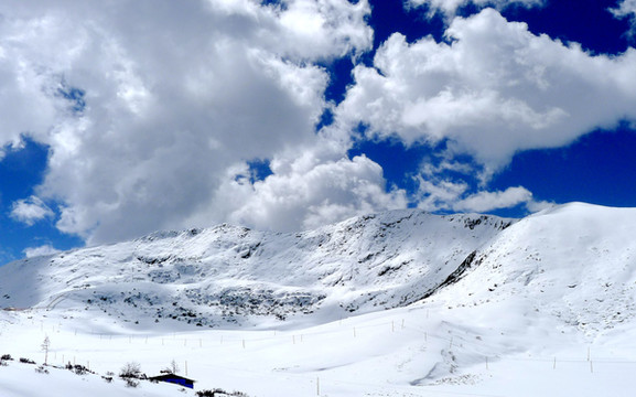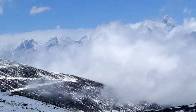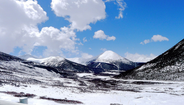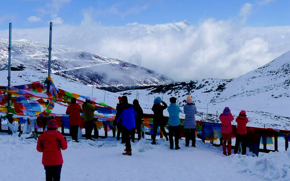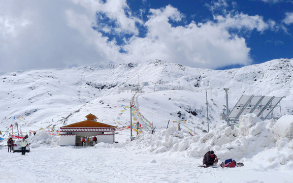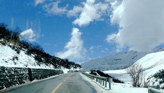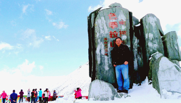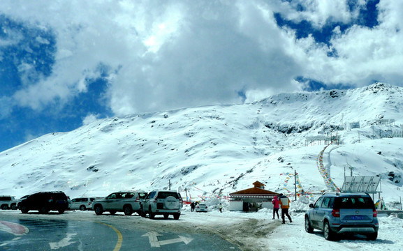 拍摄几张照片后继续前进,山上的雪景果然是越来越美,碧空下的白云也好似很低,几乎就要跟山坡上的白雪联成一体。西藏就是这么神奇,一小时之前我们还曾邂逅桃红柳绿,现时则已身处冰天雪地之中。12:25到达山顶,路旁有块高大的碑石,表明此处是国道G318的“色季拉山口”,海拔4720米。