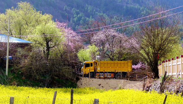17:40再次出发,邓师傅边开车边夸奖我攻略做得仔细,他说以往带客都会不停地讲解,但这次却是很少开口,因为我们什么都知道。前行不久又遇油菜花,还有许多农舍,这里应该就是索通村的真正位置。村前空地停放多部汽车,也有不少游客在油菜花田内忙碌,然而,这里却是不见雪山,景色不如我们刚才停留之处。继续前行,18:00又看到帕隆藏布江对岸的雪山脚下有大片桃花,很是漂亮,其实,林芝、波密一带到处都有桃花,只不过绝大多数都距公路较远而不被关注,唯有公路能够直抵的几座村庄特别出名,但其桃花却是并不见得最为出色。
