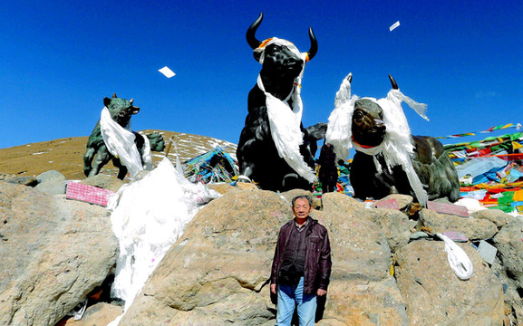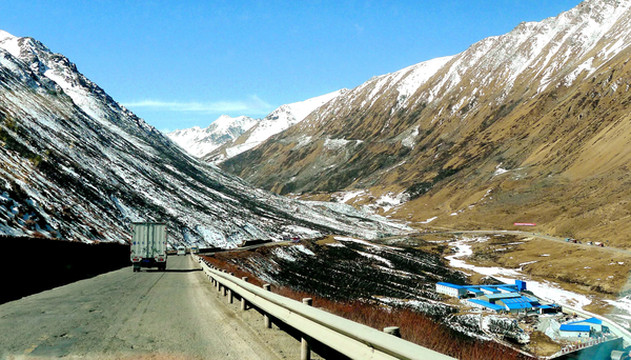 10:47驶抵墨竹工卡县日多乡的三岔路口,邓师傅介绍右侧那条简易土路直通桑日县(属山南市),我们回程返拉萨也是要经过桑日。再往前行就是米拉山,高速公路的米拉山隧道正在施工中,拉林高速钻入山体内部,我们沿着G318国道蜿蜒翻山。海拔渐高,路边的积雪也越来越多,11:16驶抵山顶,垭口石碑标明此处的海拔是5013米。2002年我从拉萨赴林芝,亦曾到过这里,刚刚经由垭口下山就遇塌方,只好又折返拉萨。记得当年山顶垭口的石碑是海拔5020米。显然,国道已经过改建,垭口的位置也有所降低。X.J.依旧“高反”严重,只是下车张望一眼就赶忙回车休息,我让邓师傅帮我拍下两张“到此一游”。