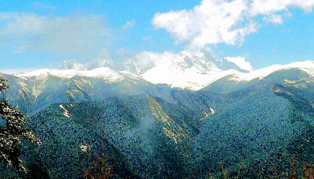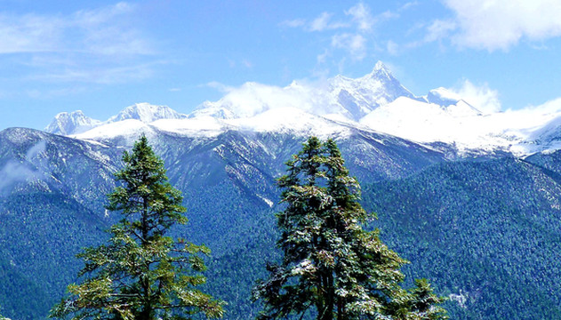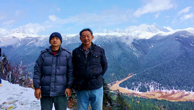 此处是川藏线上除色季拉山垭口外又一处能够看到“南伽巴瓦”的地方,“南迦巴瓦”位于喜马拉雅山脉的最东端,峰顶海拔7782米,属世界第15高峰。因为排在它前面的14座高峰全都是海拔8000米以上,因此,“南伽巴瓦”也就成为世界7000米级别雪峰中的最高者。我们初抵时刻“南伽巴瓦”仍被云雾笼罩,然而,突然风吹云散,南伽巴瓦雪峰以及位于它对面的“加拉白垒(海拔7294米)”雪峰都清晰地显露出了真容,此景稍纵即逝,赶忙请邓师傅为我们父子拍下一张站立于两峰之间的珍贵合影。路边有藏族女孩兜售松茸,闻起来味道不错,但邓师傅说现时松茸干货要千元一斤,这几十元一包的蘑菇不可能是真货。