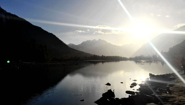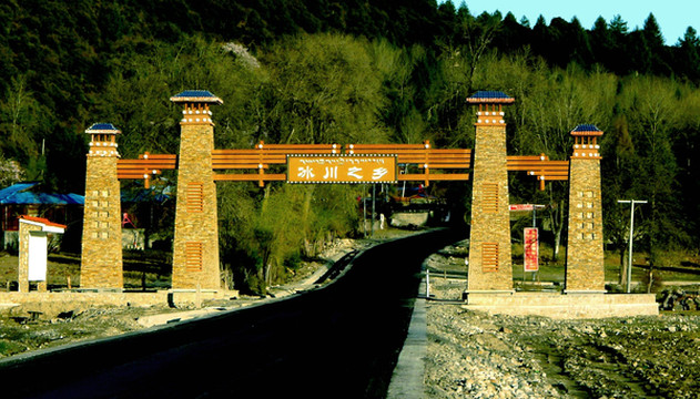 那片水面其实也还是“帕隆藏布”的河道,因为“波堆藏布”在附近不远处汇入“帕隆藏布”,于是就形成了这片较为宽阔的水面。夕阳西下,周边雪山倒映湖面,湖畔也是景美如画。拍些照片后继续前行,19:29看见国道上有座“冰川之乡”大门,波密多冰川,因而号称“冰川之乡”。随然后又看到了大片的桃花,只是距离颇远,可望而不可及。接着就进入波密县城,也就是“扎木镇”,小镇海拔2700米,四周被雪山环抱,“帕隆藏布”与国道G318都是穿镇而过。
