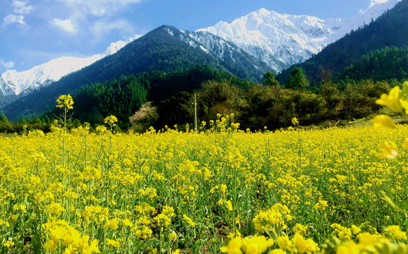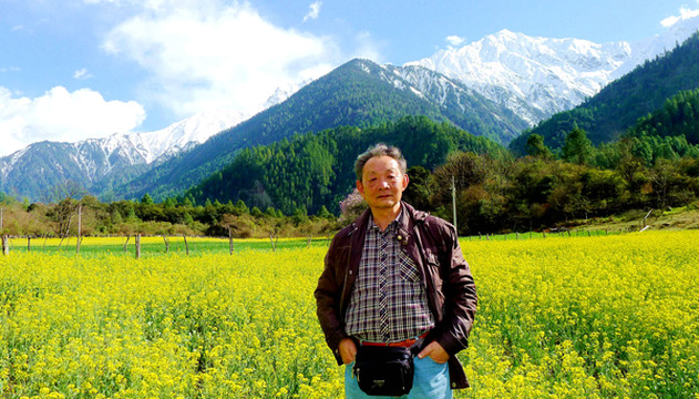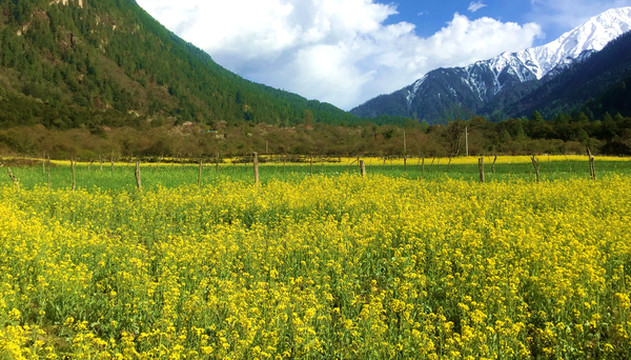 放行后继续上路,前方不远应该就是“索通”,我从网上信息得知“索通”此刻正是油菜花开,但邓师傅对此并不认同,他从未听说过“索通”有油菜花,也不认为油菜会在这个时节开花。17:29看到索通村的路牌,我立马警觉起来,瞪大眼睛搜索,不久后就看到路边木栅栏后面有大片的黄色,于是在一个木栅缺口处停车。缺口旁放置一张椅子,但却无人值守,我们刚想钻洞而入,就见对面的木屋内跑出一位藏女,声称收费5元/人。我与X.J.总计付费10元,邓师傅是司机,我没给钱,藏女也不持异议。进去后才注意到,此处不仅油菜花漂亮,而且,花田背后就是雪山,花费这10元绝对值得。
