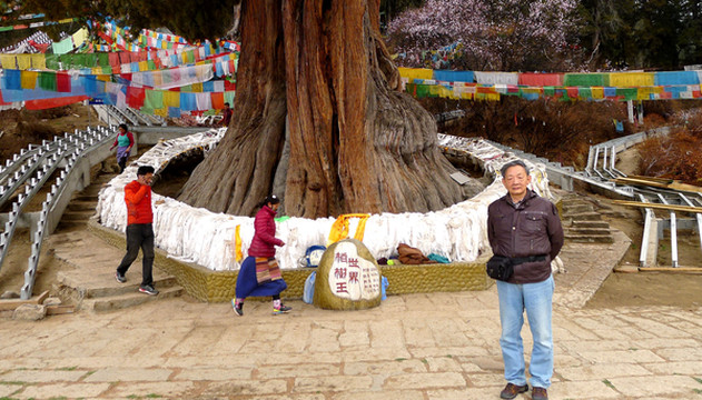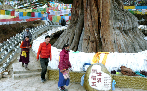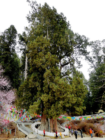 随后前往“世界柏树王园林”,那里有株巨大古柏,号称是“世界柏树之王”。景区就在国道G318的路边,位于八一镇东方约8公里处,我们9:00左右抵达。这一带原为西藏的自治区级原始柏树林保护区,后经广东省援建成为公园,淡季门票15元/人。园内遍是高大、粗壮的柏树,它们是雅鲁藏布江中、下游河谷之特有树种,称“雅鲁藏布江柏”。其中,最大的一株耸立在入园后的不远处,高约50米,须12个成年人方可合抱,树下有块“世界柏树王”石碑,表明此树已有3233岁(2013年)。巨大树身缠挂着五彩风马,有几位藏民正在绕树转经,民间传说这株古柏是苯教开山祖师“辛饶米保”的生命树。