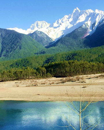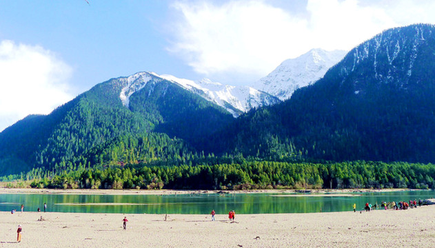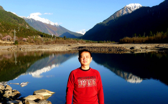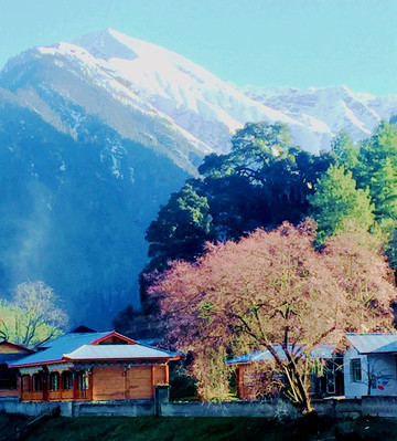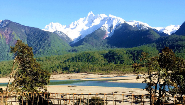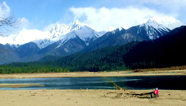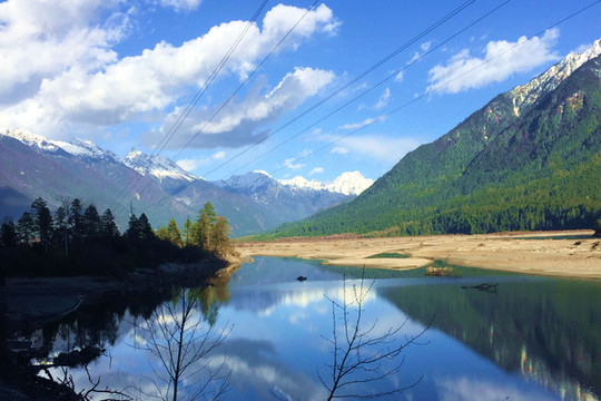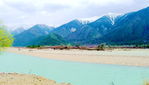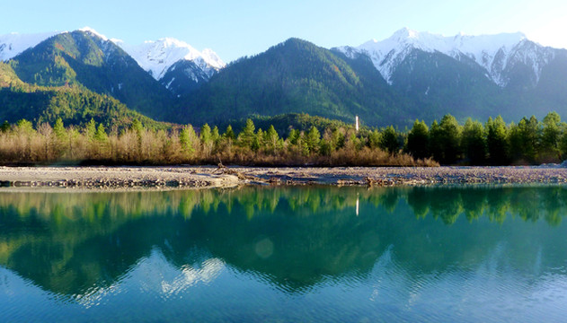 18:45离开卡巴村,再上国道G318,继续沿着“帕隆藏布”驶往波密。沿路随处可见桃花、雪山,“帕隆藏布”清澈发蓝,白云、绿树、蓝天、雪峰倒映平静水面,景色如诗如画。
