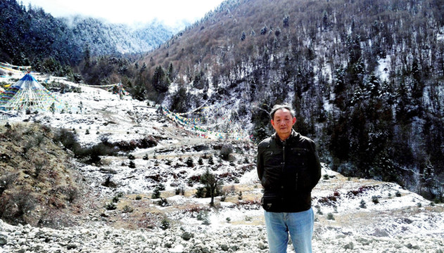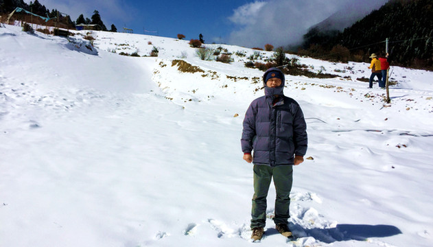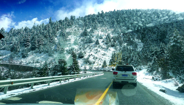 再向前行,积雪越来越多,X.J.的“高反”已基本缓解,一路上都是兴致勃勃。12:09他看到路边有一大片漫坡雪原,急忙呼叫停车,邓师傅不太情愿,声称再上面的雪景会更加漂亮,但X.J.担心“过了这村就没这店”,执意要停车,邓师傅只好照办。在此后的几日也都是这样,邓师傅总会提出自己的主张,但最终总还是由我们说了算。