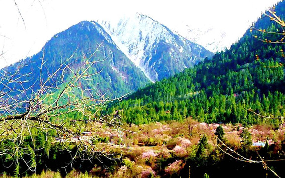 花园的高坡上有座观景塔楼,拾级登顶,眼前所见又让我们感到了无比的震撼,茂密的桃花好似大片的醉霞、绯云,从我们脚下一直向远处延伸,对面高山笼罩在气势磅薄的云雾之中,尼洋河静静地流淌,河畔的柳树刚刚发芽,翠绿、桃红交相辉映,构成一道秀美、靓丽的春日风景线,让我俩看得如痴如醉。