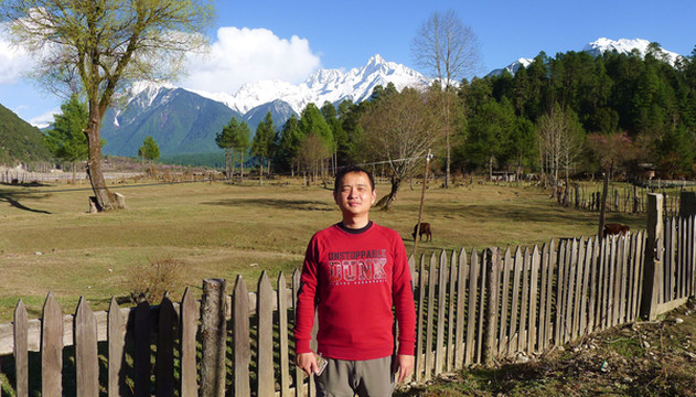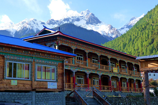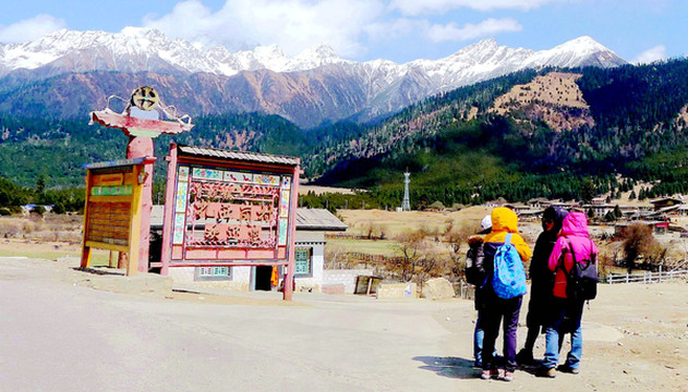 18:30右拐下国道,驶经一座村桥,来到卡巴村。网络视频系列节目“行疆”的主角“况露”独自骑行中国西南、西北,他的节目中曾经提到,G318国道的4036公里处有一座被雪山环绕的“卡巴”小村,是处风景绝佳之地,今日路过,顺便弯进去看看。现时的村内已修建了多座旅游客栈,有些还是颇具规模。我们正在瞎逛,一位藏族汉子把我叫住,声称他是村内一家客栈的老板,我赶忙向他解释我们今晚是要住在波密,此刻只是随便转转。他说无碍,现时只是想送我一张名片,让我代他宣传。他家的客栈规模蛮大,背靠雪山,前面还有一片花园。
