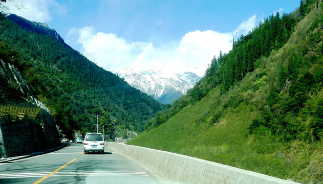 在公路上行驶,15:19突然看到区间限速的标志,趁着还没被拍照,邓师傅赶忙停车。西藏的公路实行区间限速,若是稍不注意开车过快,就得自找地方停车,把时间耗掉,否则若被抓拍,就得面临罚款。更严重是驾照降级,开大巴的司机被罚去开小车,载客量减少收入就会明显下降。邓师傅原本也是开大巴,后因不留神被罚,只能改开小车。我们耗完时间刚走不远,又遇前方施工再次停车,一长列的汽车在雪山下排队,川藏线真是风景如画,就是随便堵车一下也能拍摄到靓丽的风景。