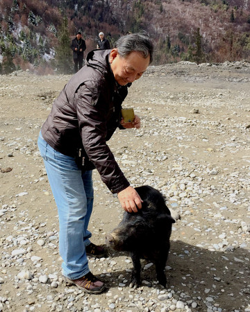 大约是11:20,随着最后两位女运动员抵达,公路开始放行,我们也驱车上路。右侧出现“八一特大桥”,它跨越尼洋河,连接林芝机场高速。我们并没过桥,而是沿着国道G318继续前行,赴波密。国道开始爬高,11:47看到林芝镇,它就是原来的林芝老县城,林芝撤县设市后将首府迁至八一镇,此地也就改称林芝市巴宜区的林芝镇。小镇位于“色季拉山”脚下,海拔约3000米,比“八一镇”稍高。继续前行,路边开始出现积雪,初见雪景的游人都纷纷停车拍照。我们又在此处遇到几只藏猪,也还是行为似狗,愿意跟人亲热。