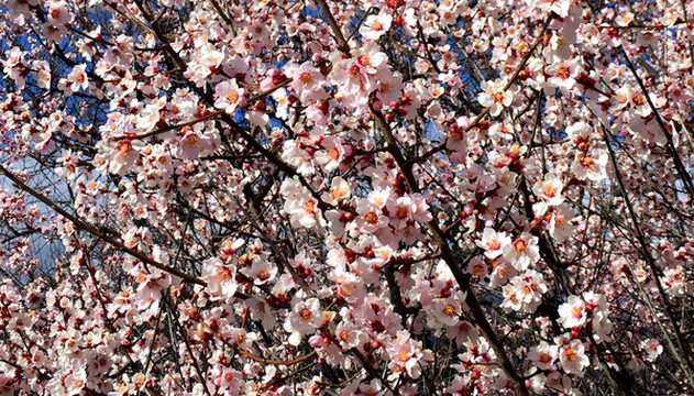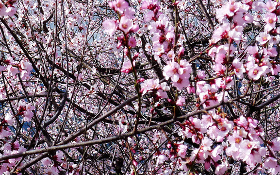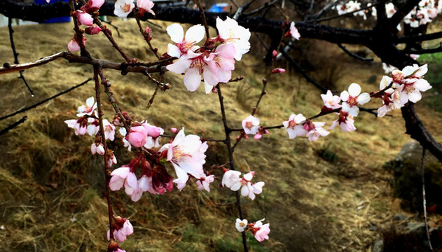 从巨柏园前往嘎拉村约7~8分钟车程,一路上看见很多警察,我们猜想是有大人物要来参加桃花节,然而,下车后方得知,桃花节已于3月25日开幕,今天只是配套活动。林芝桃花节始于2002年,现今已是第15届,门票也逐渐上调至30元/人。两人购票进入,满园的桃花也立即映入眼帘,此处的桃树都是野生,品种应该是与内地的“毛桃”相近,都是先开花、后长叶,不像内地公园中常见的观赏桃树“碧桃”那般,花开时节同步长出绿叶。林芝“野桃”的花朵不如“碧桃”硕大,花色也不如碧桃艳丽,多为粉白或粉红,然而,相比于内地桃树的矮小植株,这里的“野桃”却都是真正的大树,树干粗壮、枝杈繁密。花开的场景也非常狂野,密密麻麻的花朵遍布高大树冠,层层叠叠,再映衬蓝天,景色可谓是难得一见,让我们两人都深感不虚此行。