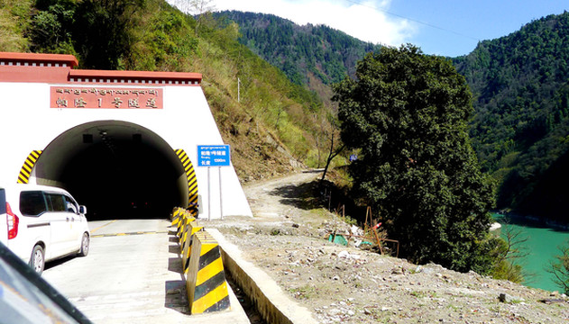 16:05进入新修建的“帕隆2号隧道”,出洞立即是“迫龙沟特大桥”,过桥后没走多远又进入“帕隆1号隧道”,这两洞一桥让现时的国道G318完全避开了旧时川藏线的“排龙天险”大塌方区域。如今,在“帕隆1号隧道”的入口右侧仍可看见那段“天险”老路,只是设置了大型水泥块,阻隔辆不能驶入。那段老川藏线全为土路,只有约一车道宽,沿着帕隆藏布江蜿蜒,汽车就在江边的悬崖上行驶,经常发生重大交通事故。
