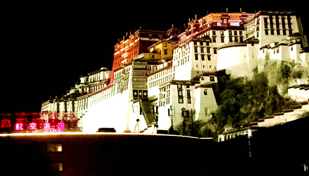 20:00的拉萨依旧是天空明亮,晚饭打算吃藏餐,两人在广场东侧的宇拓路上找到一家“冈底斯藏餐尼泊尔餐厅”,经服务员帮助点了几种菜肴,尝试后感觉尚可接受。饭后返宾馆,顺路在(康昂多南路/北京路)十字口拍下几张蛮不错的达拉宫夜景。21:45返抵航空酒店,两人除去稍感“气短”,其实并无明显高反症状。