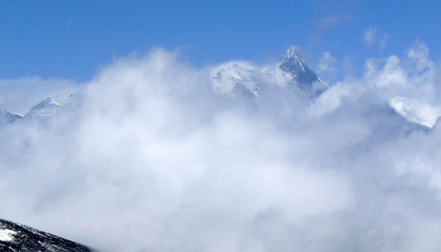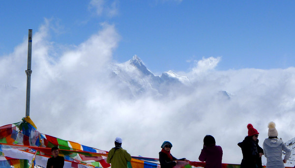 色季拉山垭口是观看“南伽巴瓦”雪山的最佳位置,然而,这座雪山终年云遮雾绕,极难有缘一睹其真容,所以,它也有“羞女峰”的称谓。我们在垭口逗留约20分钟,云雾中的“羞女”也是仅有片刻时间显露一下尖顶,引起游人一阵欢呼、狂拍。