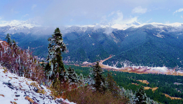 继续登山,11:54在“尼洋风光观景台”停车,山脚下的大片房舍就是刚刚过路的林芝小镇,稍远则是苯日神山以及富饶的尼洋河三角洲,远处的高山被厚重云雾笼罩,仅仅露出积雪的山巅。