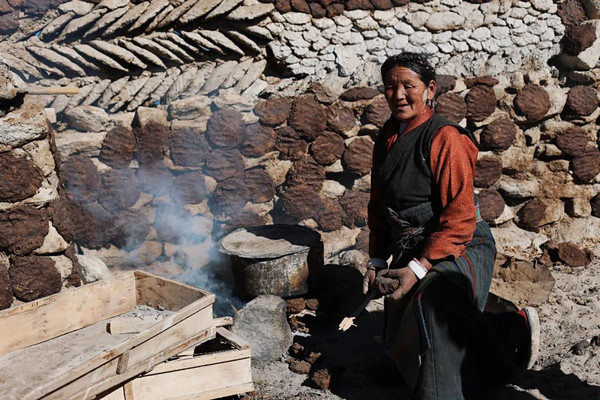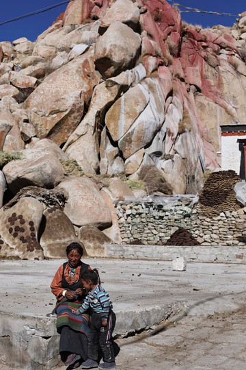 墙上糊满了牛粪,一个藏族老奶奶在阳光下煮一锅不知道是什么的饲料。牛粪在藏族人心中可是个宝贝,常常见到。