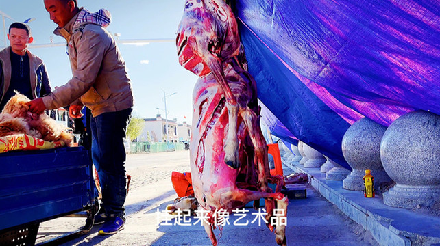 离开老定日岗嘎前在小镇转了转,街心有一个固定羊肉摊,每天清晨都有村民将昨夜宰杀好的整羊拉到这里,挂在篷布下论只卖,至少也要一只羊的四分之一才肯出售,问了问,四分之一大概300-400元,可惜我买过来没地方烧烤。他们大块买羊,估计也是大块吃肉,很有民族特色。