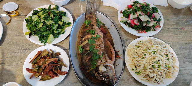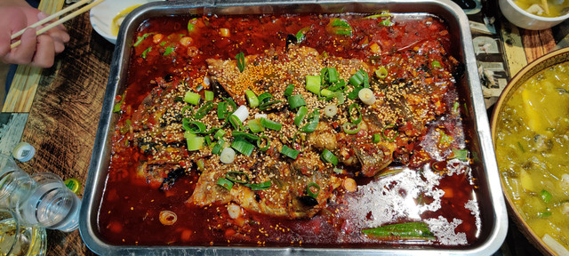 先要满足我们的胃,晚餐找到一家活鱼店,一盘麻辣烤鱼。