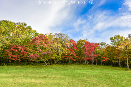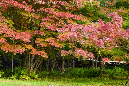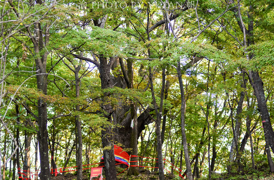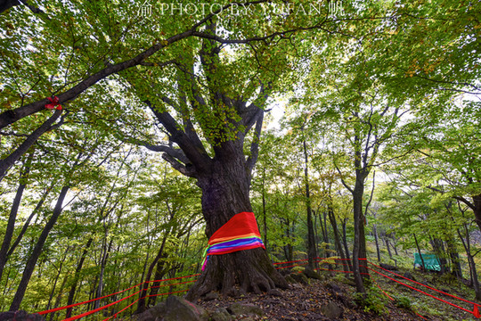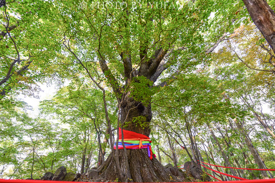 我们到达山顶的时候已经是傍晚时分,碧绿如毯的草甸四周是原生态的森林景观,那时候枫叶还没有完全红,但已经开始呈现出五花山的形态。当时我正准备换镜头好好拍拍红枫的细节,当地的朋友却神神秘秘的告诉我“走,带你去看看山中的一棵神树,已经有2000多年的历史了。”