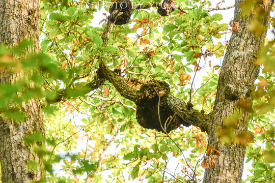 于是,我们跟着他穿过丛林,踩着森林里松软的泥土,大约走了半个小时左右,终于来到一个用红绳围着的高在古橡树跟前,这棵被称为神树的古橡树坐落在一座小山丘的顶部,地势中间高,四周低,远远望去,周边的树林形成了向神树膜拜样子,景观十分奇特。古橡树高约30米,根茎6.8米,胸径4.8米,需四个成年男子展开双臂才能刚刚环抱。古橡树高大壮硕,枝干遒劲沧桑,生机勃勃,枝繁叶茂。根部如同蟠龙卧山般坚实地延伸到地面和岩石中间,峻岭之上,粗壮的树身上面,十几根粗大的枝干向四周舒展开来,形成了巨大的树荫奇观。
