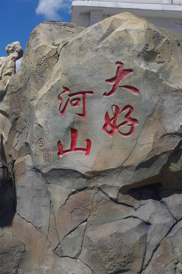 当我们原路回程的时候,我们的车又在长白县城停了一会,于是,我在江边,拍了一张“大好河山的刻字,以示对这次行程的纪念。