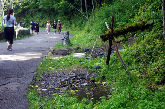 这里的水非常清。路边,不时引出水管来,供游人接水喝,盛夏时节,十分清凉。