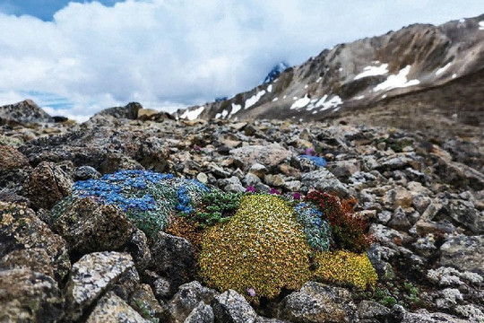 垫状植物的生存策略则更加“谦卑”。它们贴地匍匐,通过团结共生形成微型暖房。在海拔4500米的强风走廊中,不同种类的垫状植物如红景天、雪灵芝等共同组建生命堡垒,展现植物间互助共生的生存智慧。