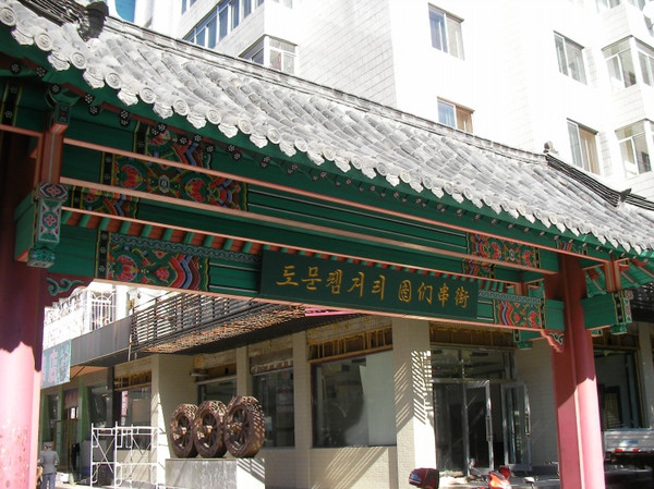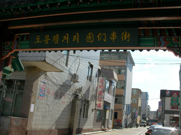 早餐后步行到图们大厦,旅游局还没有上班,又回旅馆停一会,然后出来去图们江公园并到图们口岸,看到了国门,看到了边境线,看到了对面的另一个国度,看到了对岸的炊烟,一条江将两个国家分得清清楚楚。听见了鸟叫,不知道这些鸟的国籍是中国还是朝鲜,它们应该不需要通关就自由往来吧,由口岸步行过口岸大街、友谊街、光明街,又到图们大街,发现旅馆主要就在光明街。在友谊街与光明街之间有一个农贸市场,都是常见的蔬菜或水果。图们的街道比较整齐,站在任何一个十字路口都能看见四周的山,并且有一面是朝鲜的境内。真是很不错的一个小县级市,图们有10多个民族,朝鲜族占57%,招牌上都写着朝文,很醒目。到旅行社还不到8点半,服务员告诉我需要提供户口本复印件可以去朝鲜,并且到15、16号才有团,我很犹豫是否再等下去。
