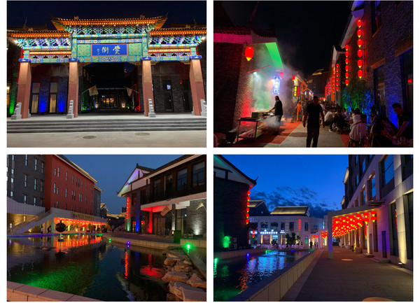 十里铺,桥拱下,亭台阁楼处,各种暖冷色调的点、块、线状灯光相互辉映。高耸的徽派建筑,楼亭的飞檐翘角,都被灯光勾勒出黑白之外的鲜明轮廓。民宿、酒家的灯笼点缀其间,透露出异常温暖的情愫,整个海龙湖十里铺仿佛琼楼玉宇,直让人有恍然不知身在何处的惊叹。