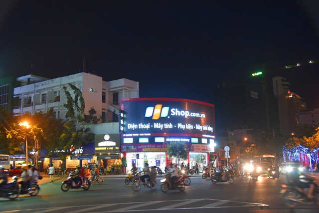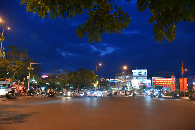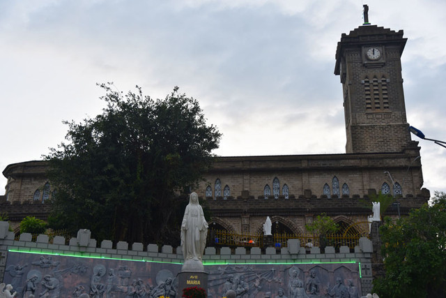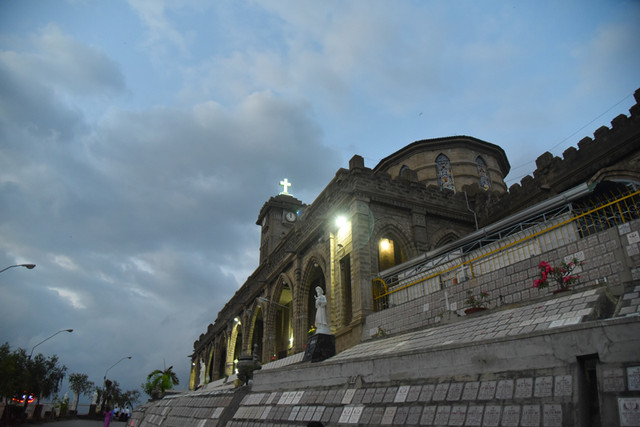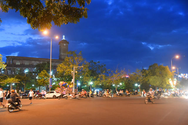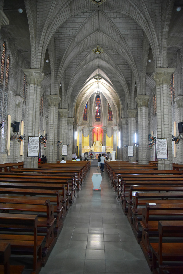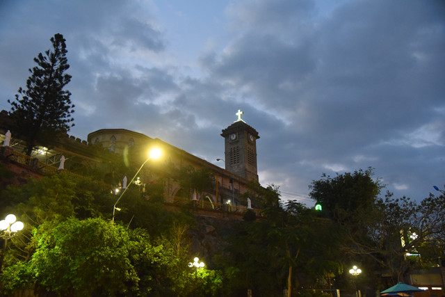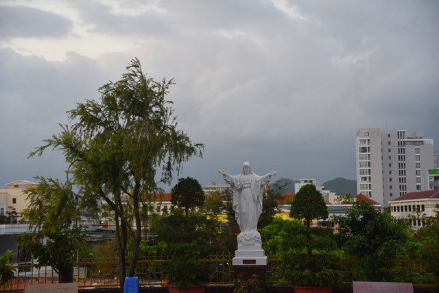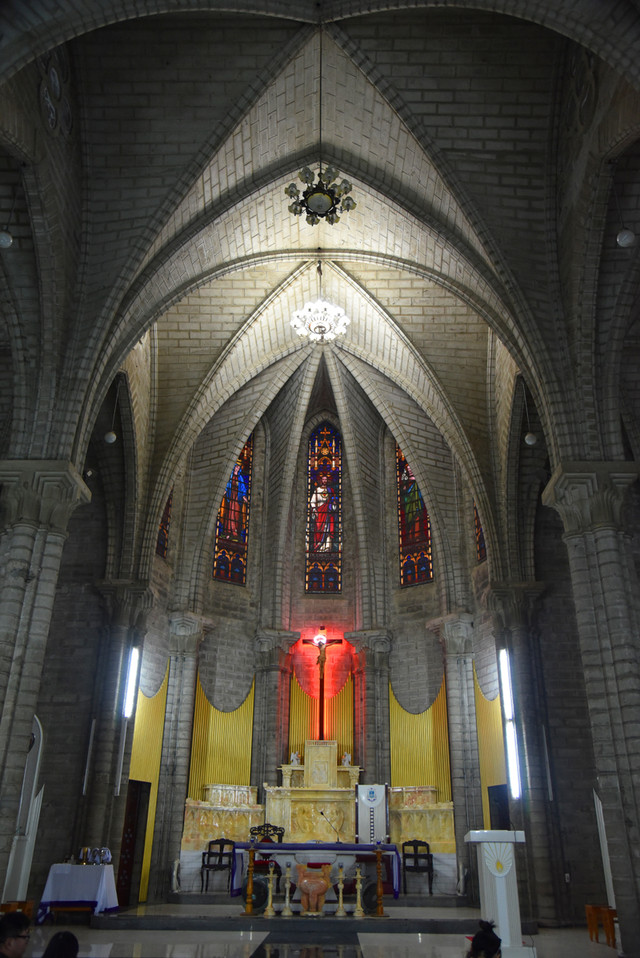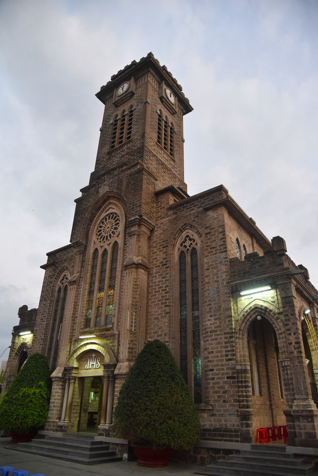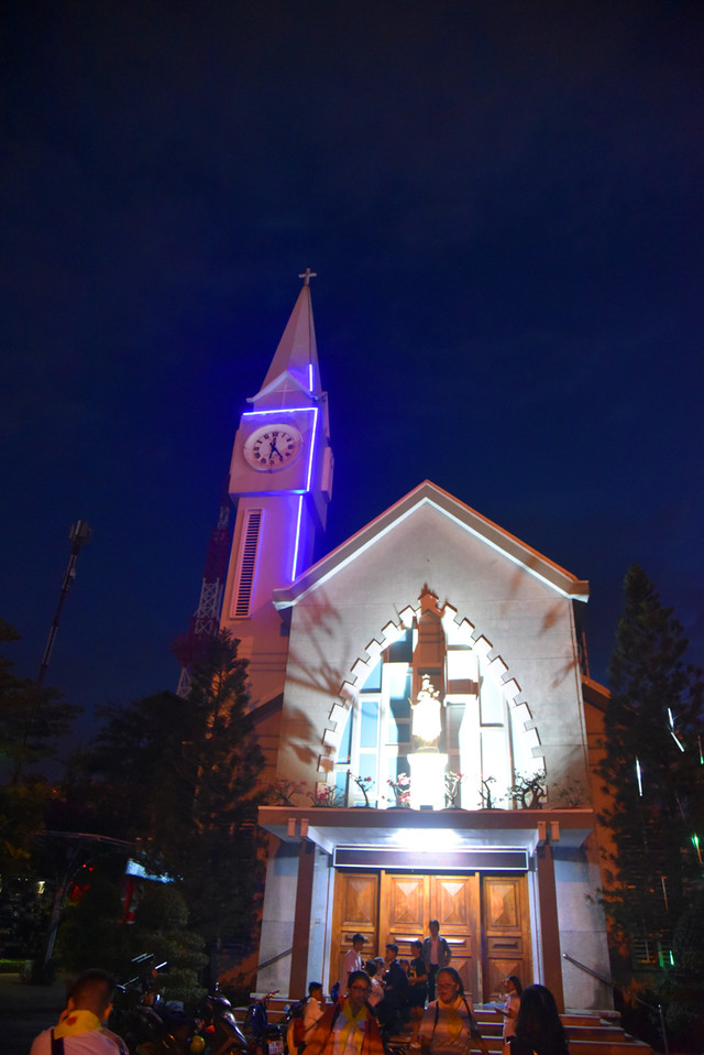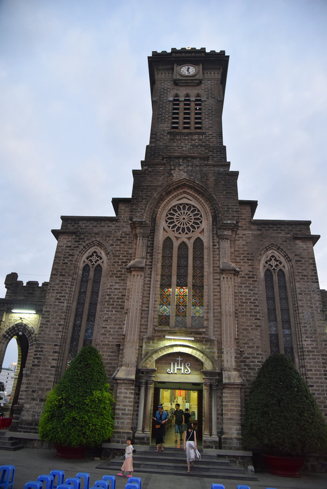 傍晚时分,晴转多云,我们步行到芽庄教堂,远远看过去,一座法国哥特式风格的建筑庄严雄伟,高高伫立的钟楼十分醒目。由于教堂位于芽庄市中心的一处高地上,紧邻熙攘的街头,外面有不少的小商贩兜售商品,有点烦人。