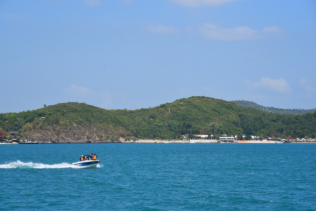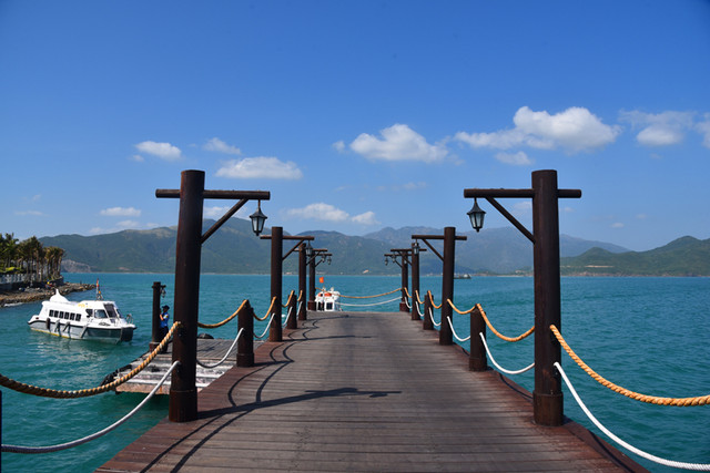 啰啰嗦嗦,转入正题,来到码头,乘船出海。我们坐上游船,穿戴好救生衣,乘风破浪驶向大海,欣赏沿途海景风光,不到半个小时抵达至尊岛。这正是:船靠码头人上岸,阵阵海风吹拂面,步行栈桥到海岛,葱葱椰林眼前现。