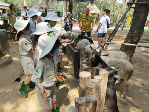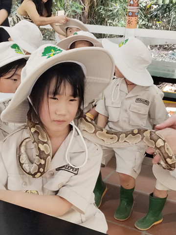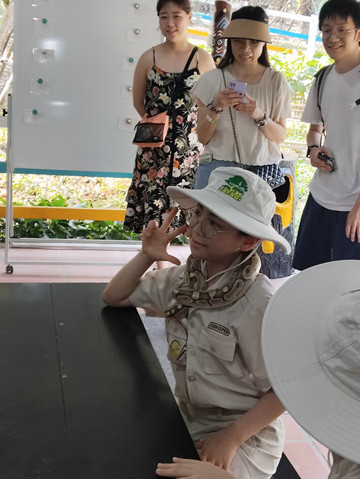 整个动物园的特色是“小小饲养员”,可以现场买票也可以线上预约,现场买票40万一个孩子,但是必须6岁以上,有个5岁的被拒绝了。但是线上预约我们一起的有个2岁多的。各个国家的小孩子一起,先换上饲养员的服装,老师讲解各种动物和动物吃什么,全英文,然后让孩子们给动物们准备食物,还有活的虫子,接着去喂羊,兔子,狐獴这些小动物,结束后给他们戴蛇和蜥蜴拍照,以前看到过有小老虎,估计小老虎长大了。课程10点半开始,12点结束。