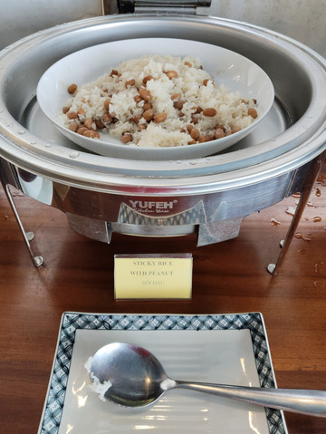 早餐厅里面都有一道糯米粉,英文叫sticky rice,加上花生或者花生碎,挺好吃。
