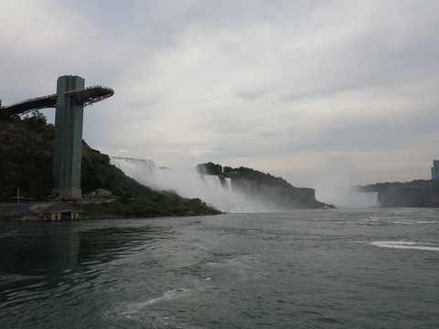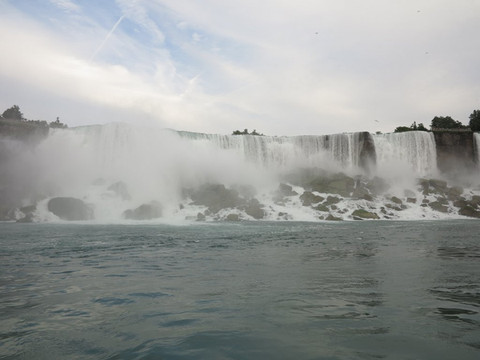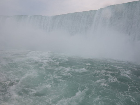 河对岸的加拿大小镇到处是酒店和赌场,完全是为了游客开发的。游船基本20分钟左右一艘,甲板上站满游客,出发去看大瀑布。瀑布实际由3部分组成,马蹄型瀑布、美国瀑布和婚纱瀑布。美国瀑布和婚纱瀑布全部在美国境内,而马蹄形瀑布最为壮观属于跨国的,在岸上观看,美国境内看到的只是尼亚加拉瀑布的侧面,而在加拿大可以一览全貌,所以很多人说加拿大看着更爽,有点黄河壶口瀑布两岸的感觉。我们的游船直接开到马蹄瀑布下,水雾弥漫,确实壮观。