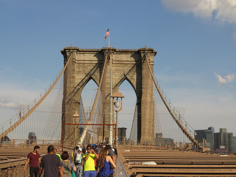 离开911遗址,不远就是布鲁克林大桥,纽约的布鲁克林大桥横跨纽约东河,连接着布鲁克林区和曼哈顿岛,是纽约最早的桥,是当年世界上最长的悬索桥,也是世界上首次以钢材建造的大桥,落成时被认为是继世界古代七大奇迹之后的第八大奇迹,被誉为工业革命时代全世界7个划时代的建筑工程奇迹之一。