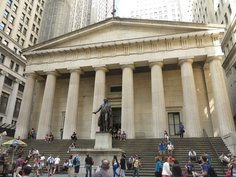 这里有太多的传奇,各大投行,牛逼金融企业,都在这里占据一席之地。据说大牛的人物为了避开纽约的堵车都是坐直升机上下班的,街道不远就是停机坪。交易所对面是联邦大厅,很意外的是这里曾是美国第一届国会所在地。