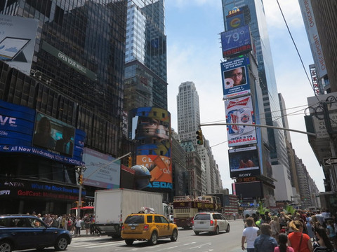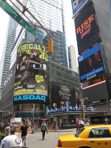来美国的这些天,也算是品尝了美国式的美食了。吃饱喝足,路边买了好吃的樱桃,不远就是时代广场和百老汇大街,时代广场就是无数的显示屏,街角的大屏幕下方显示着纳斯达克,这里熟悉的画面以前在电视里看过无数次,感受一下这里的热闹,下午的时间留给商店吧!