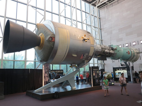 停车只能2个小时,赶紧出门去开车,到了国家航空航天博物馆前停车吃热狗。原本以为时间不够准备放弃这里,但想既然来了还是赶着来看看吧!没想到这里是当天参观最值得看的博物馆。进门就看到好几个返回舱,屋顶挂着飞机,都是真家货,不起眼的月球石是可以随意触摸的。看来美国人搞历史不行,现代科技展览那是绝对的厉害。