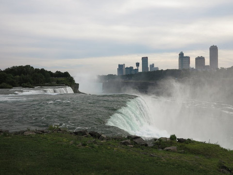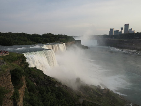 第二天的飞机终于顺利起飞,下午3点多到了布法罗,昨天托运的行李已经在机场等着我们,美国这个航运大国,这方面还是很有经验的。一出机场,心情顿时大好,这里没有高楼,只有舒服的空气。机场对面就是一排的租车行,中国驾照你只需要让工作人员看懂就可以租车,不存在公证的问题,你中国的公证人家美国人也不懂呀,但是美国的各个州据说法律都不一样,可能有个别的会不让你租车,但这里—纽约州可以。布法罗又叫水牛城,基本来这里的都是为了去尼亚加拉看瀑布。顺利提车,第一次在美国开车,在老婆导航设备的带领下,几十公里的路程就直达尼亚加拉大瀑布。在到达瀑布景区前的公路上就看到这里弥漫的水雾,后来发现真的是瀑布拍打造成的。停车场10美元的停车费,瀑布开放到晚上8点,没有门票,直接开始参观。尼亚加拉瀑布是世界第一大跨国瀑布,世界第二的跨国瀑布是中国和越南的德天瀑布,和老婆几年前去观摩过。这里位于加拿大安大略省和美国纽约州的尼亚加拉河上,美加都管自己的小镇叫尼亚加拉镇。步行进入景区,穿过游客中心,步行不多就可以在边上观景区域看看大瀑布的侧影,很壮观,所有的不顺利都抛在脑后。
