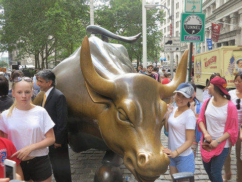 时间的关系放弃了去移民局遗址的参观,直接坐船回到了曼哈顿,船上是看自由女神和曼哈顿下城的绝好角度。码头步行不远就是金融去,不起眼的马路中央就是那头牛气冲天的大铜牛,牛身各个器官给游客摸得光亮无比,拍照留念,继续探访高端的华尔街。