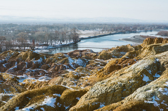河的北岸因河流冲击和狂风侵蚀形成悬崖式雅丹地貌