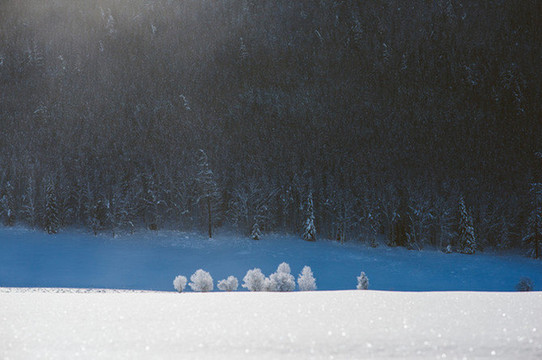 稍近的地方是几棵灌木,因雾凇变得洁白而冷艳