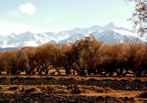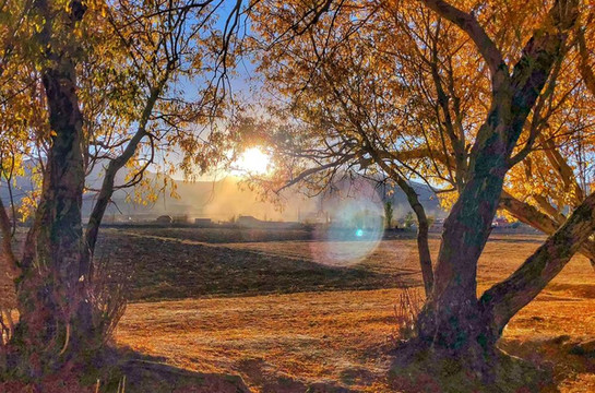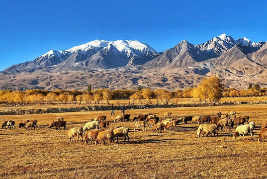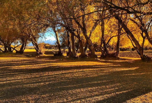 金黄的草场,弯弯的小河,缭绕的云雾、壮丽的雪山,在秋天里拼凑出了塔合曼湿地最美的样子。