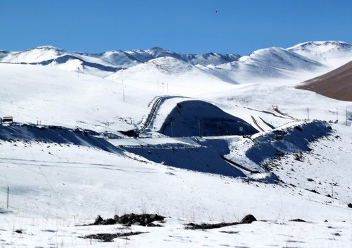 快到雪山顶上的时候,回头看上山的路,像一条黑色的蛇,蜿蜒在雪山中。
