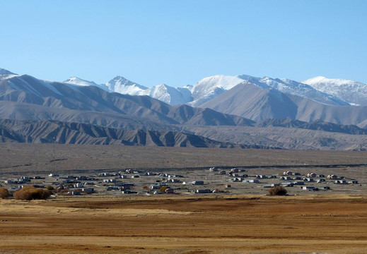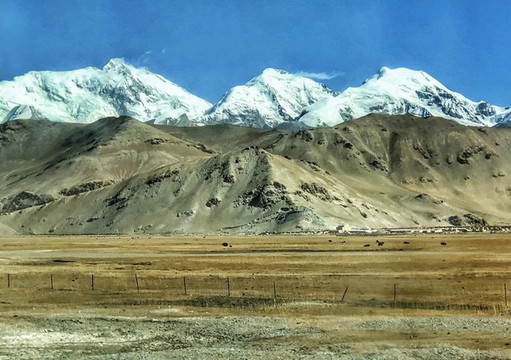 远处雪山下的房屋,属于塔县塔合曼乡。