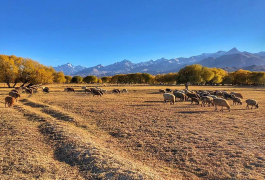“树洞”附近的雪山和羊群