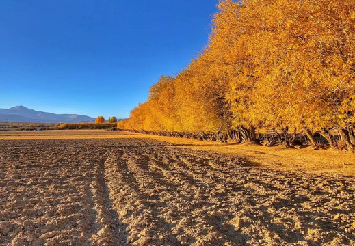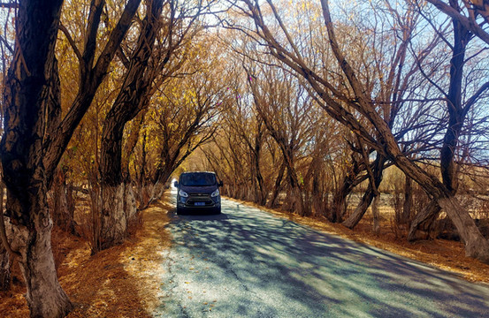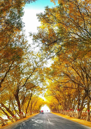 塔合曼乡有两条杨树围成的像树洞一样幽深的小路,第一条“树洞”大约有1000米长。有很多游客在这里拍照。