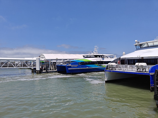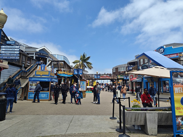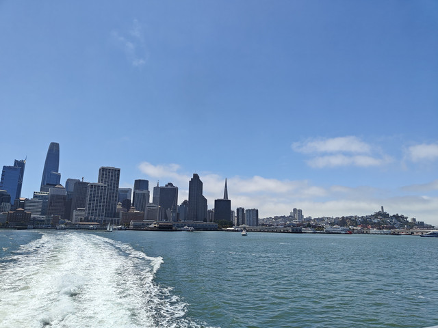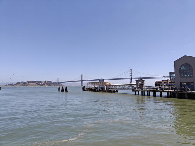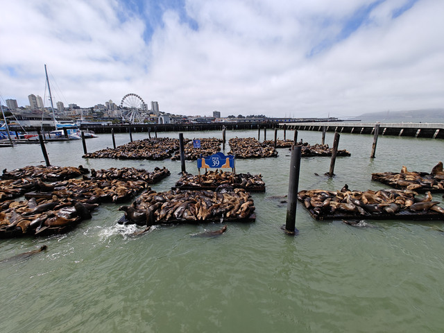 渔人码头,吃喝玩乐样样俱全。33号码头有船去ALCATRAZ岛(恶魔岛),有名的39号码头除了各种饭店饮品店和纪念品店外,特色是可以看到成群的海狮(学到了区分海豹和海狮,按照学习的知识,个人认为39号码头上的是海狮)。在码头可以看到去往北面Sausalito的金门大桥和去往东面Oakland的旧金山--奥克兰海湾大桥。坐在渡船上可以远望旧金山地标。